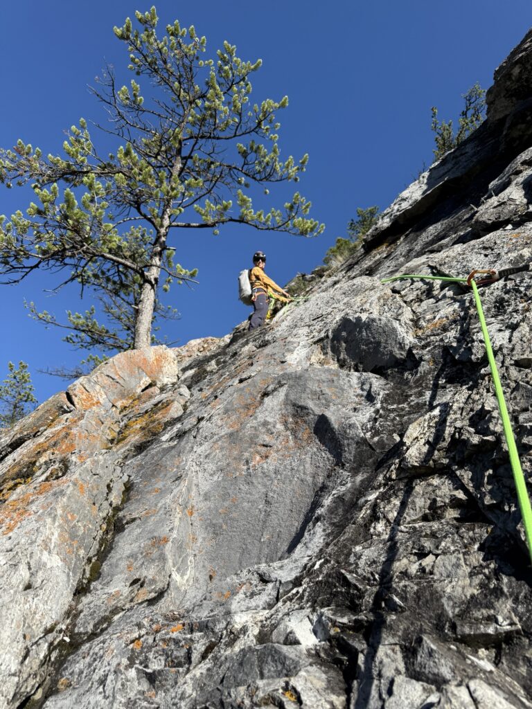 We settled on a couple of easy climbs up Tunnel Mountain, Dancing Sasquatch, a new route by Brandon Pullan and Le Soulier, both around 5.6. I had done the latter in 2014 and recall it being kind of damp but easy. Perfect for the day. Incidentally, it’s called “Le Soulier,” French for “the shoe” because the FA had left a shoe hanging on the third pitch.
