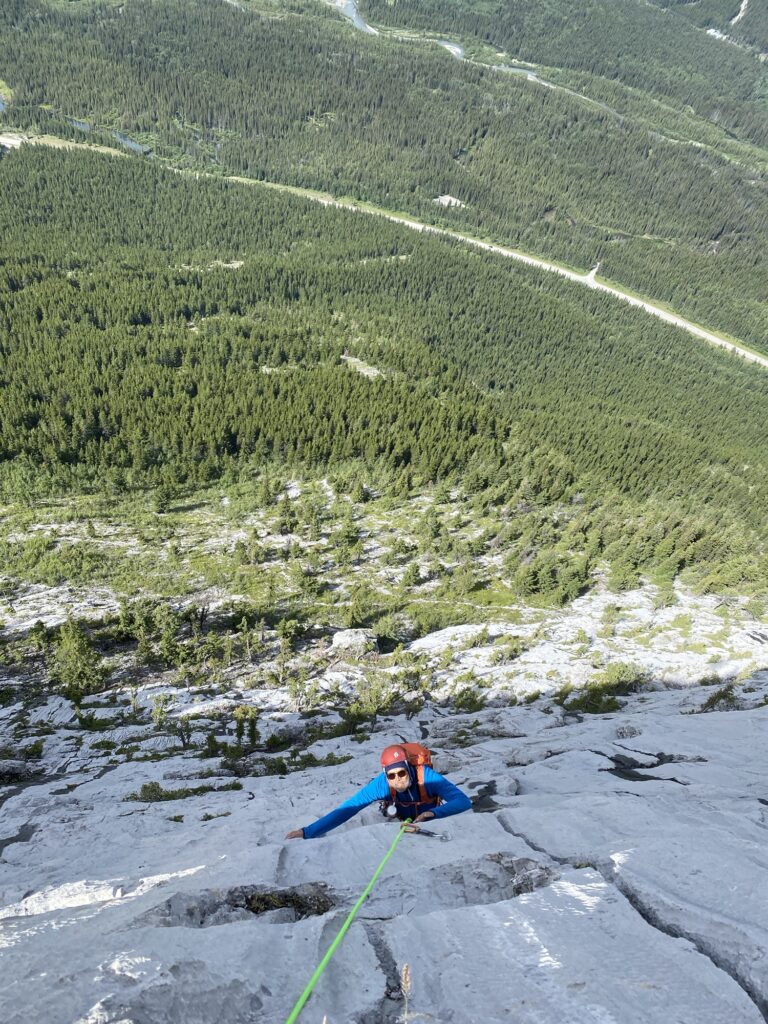 I’d had two great days of climbing. The day before was on Daddy’s Day Out on Delta Peak across the highway from Nakisha Ski Resort. Rated a 10c but the most pitches were 5.8 or less. I “French Free’d” the 10c with a little help from Maryse L’Heureux from Yamnuska Mountain Adventures, a group I’ve used for ten plus years and highly recommended. In truth, most of the climb was spent desperately groping for holds, like a near sighted man searching for his glasses. The rock quality was excellent – think Aftonroe on Guides Rock in Banff with runnels, and sandpapery white limestone, but pitched at a higher angle, taking the grade from 5.6 to 5.8+.