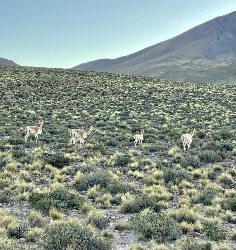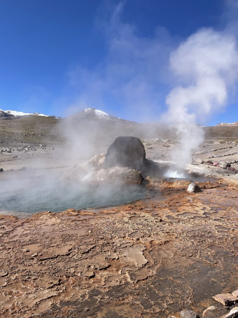 The geysers themselves sit like a family, content to settle in the valley, surrounded by volcanoes, each sending its white, vapory silhouette into the sky before the breeze dissipates it. Here and there, boiling water bubbles up in rock bowls, like a witch’s cauldron. Vicuñas and guanacos, deerlike creatures, wander with their families through the boiling hot steam of the geysers, seemingly unconcerned.
